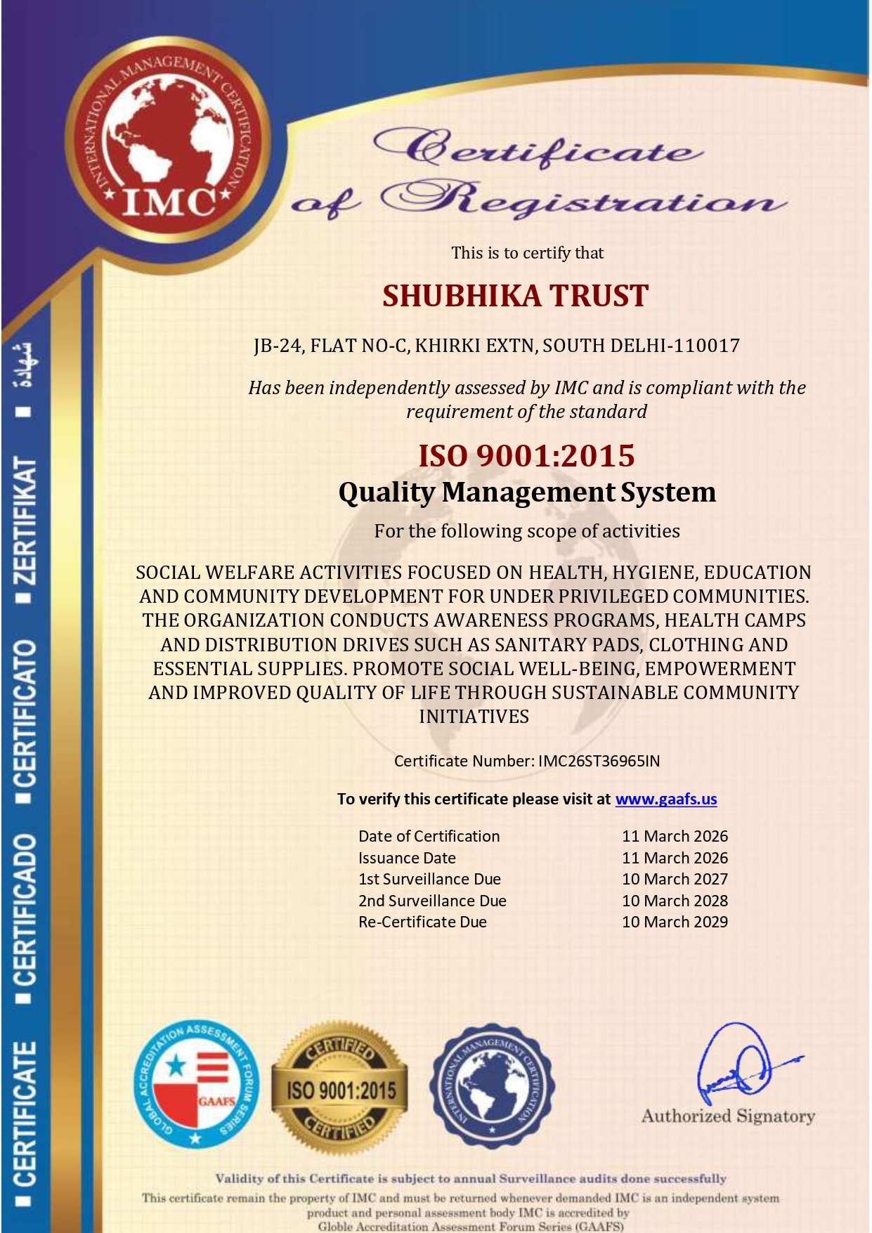 Documents Gallery Together for Change, Hope for All 12A Certificate 80G Certificate Section 60 Cert NGO Darpan Trust Pan Trust Deed Udyam Registration Certificate Approval Letter for form CSR1 ISO 9001:2015 Certificate